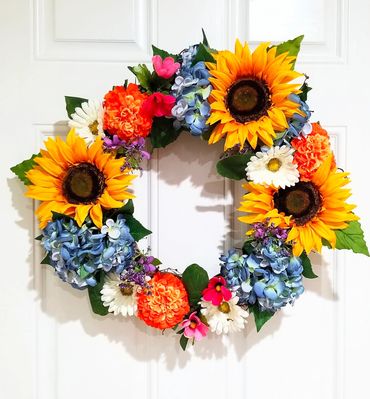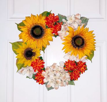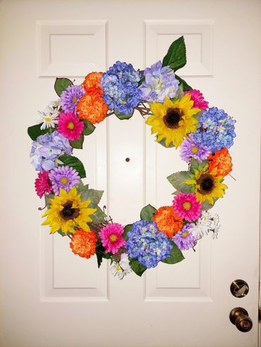 With a love of flowers, color and wanting to decorate my home I got into wreath making and arrangements. I used fake flowers and made my own arrangements for my wedding for several decorations. After the wedding, I really wanted to make use of the leftover flowers which were used for the pew cones and repurpose them. I made a few pieces from my wedding flowers (blue hydrangeas and sunflowers) along with other pieces for seasonal decor. I am honored to have made custom pieces upon request as well for someone to enjoy in their home as well.